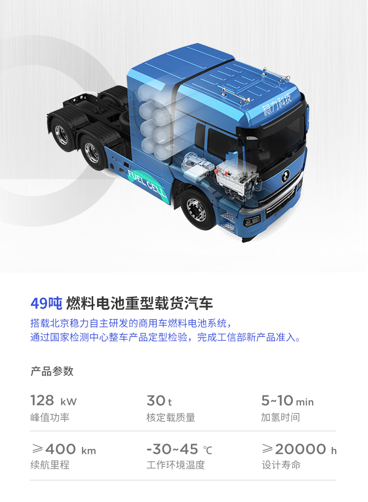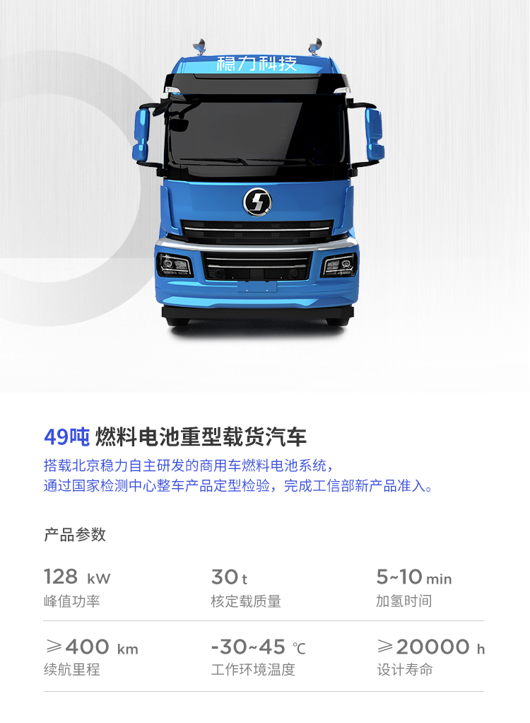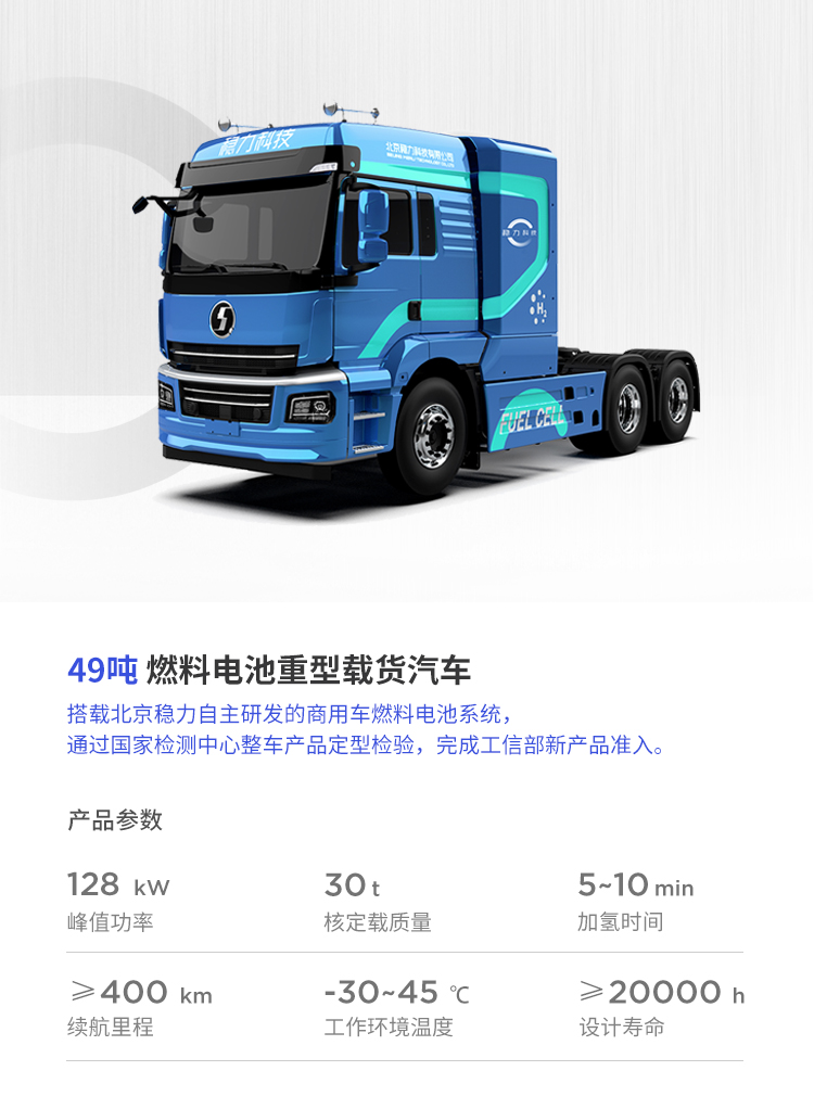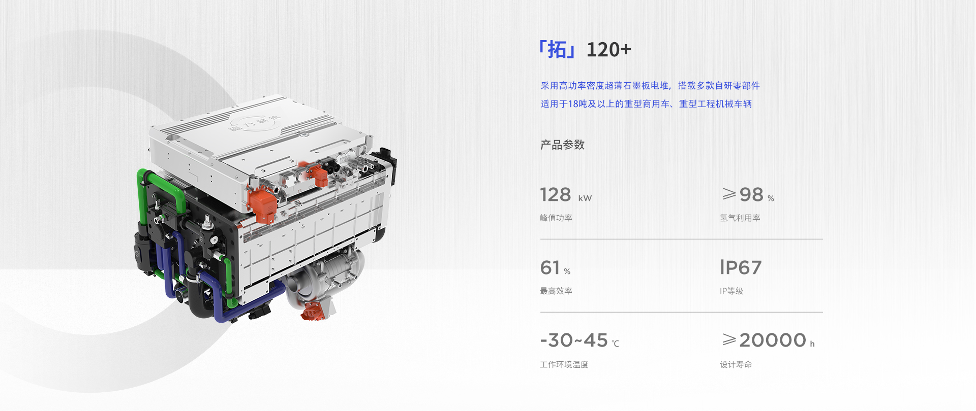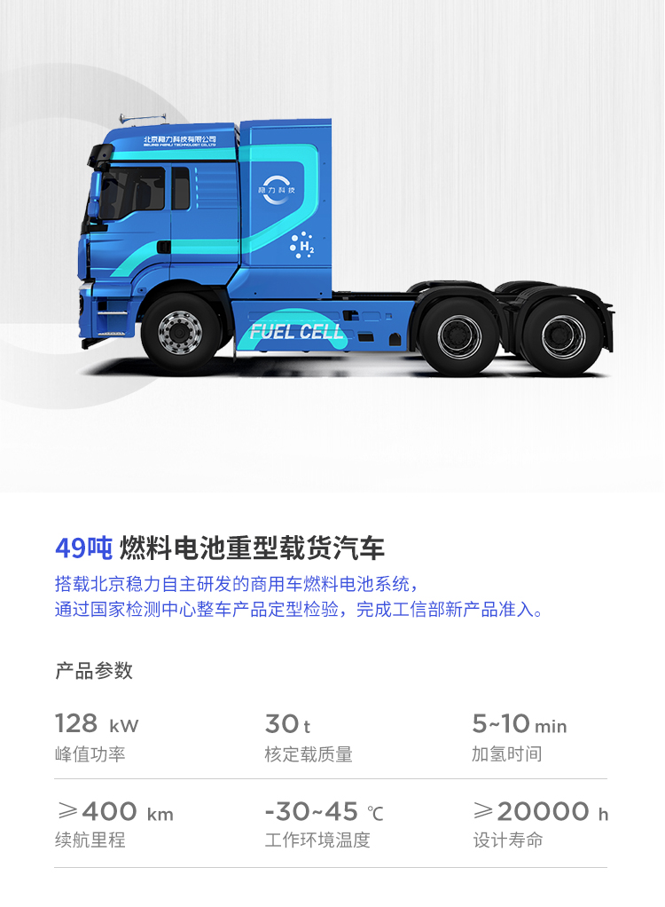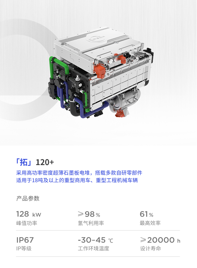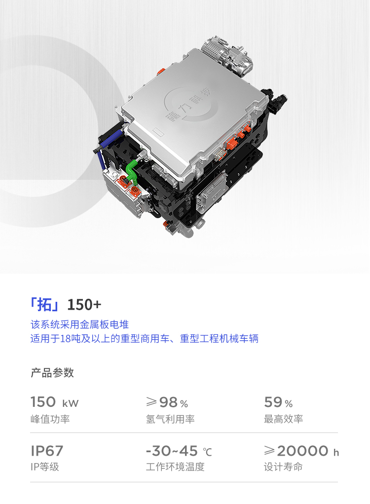 該系列燃料電(diàn)池系統功率覆蓋範圍 80kW~150kW,可應用于輕、中、重型商用車輛與重型工(gōng)程機(jī)械車輛。