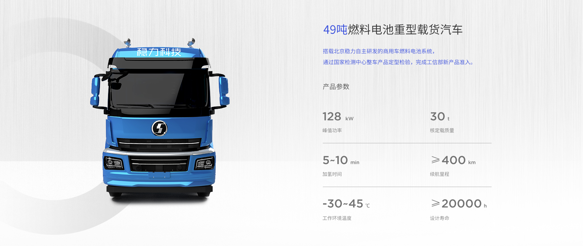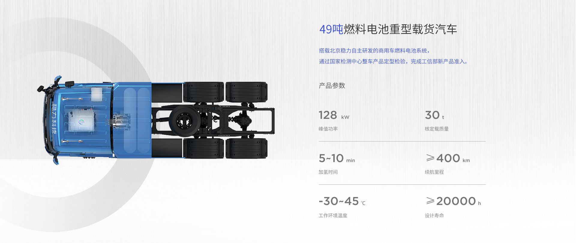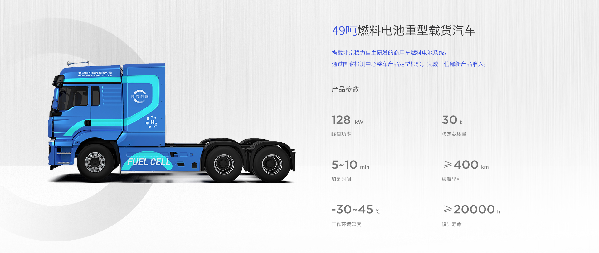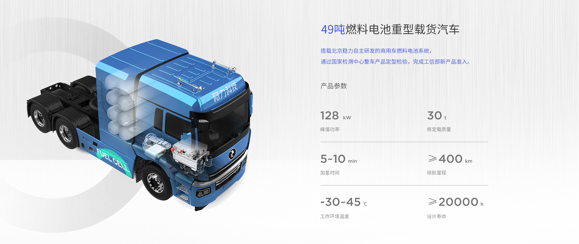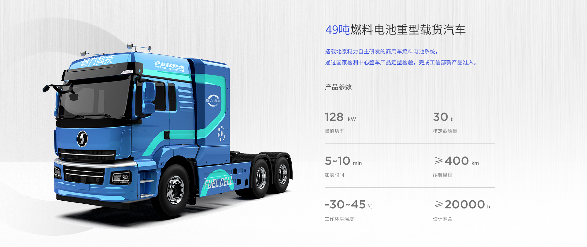 該系列燃料電(diàn)池系統功率覆蓋範圍 80kW~150kW,可應用于輕、中、重型商用車輛與重型工(gōng)程機(jī)械車輛。