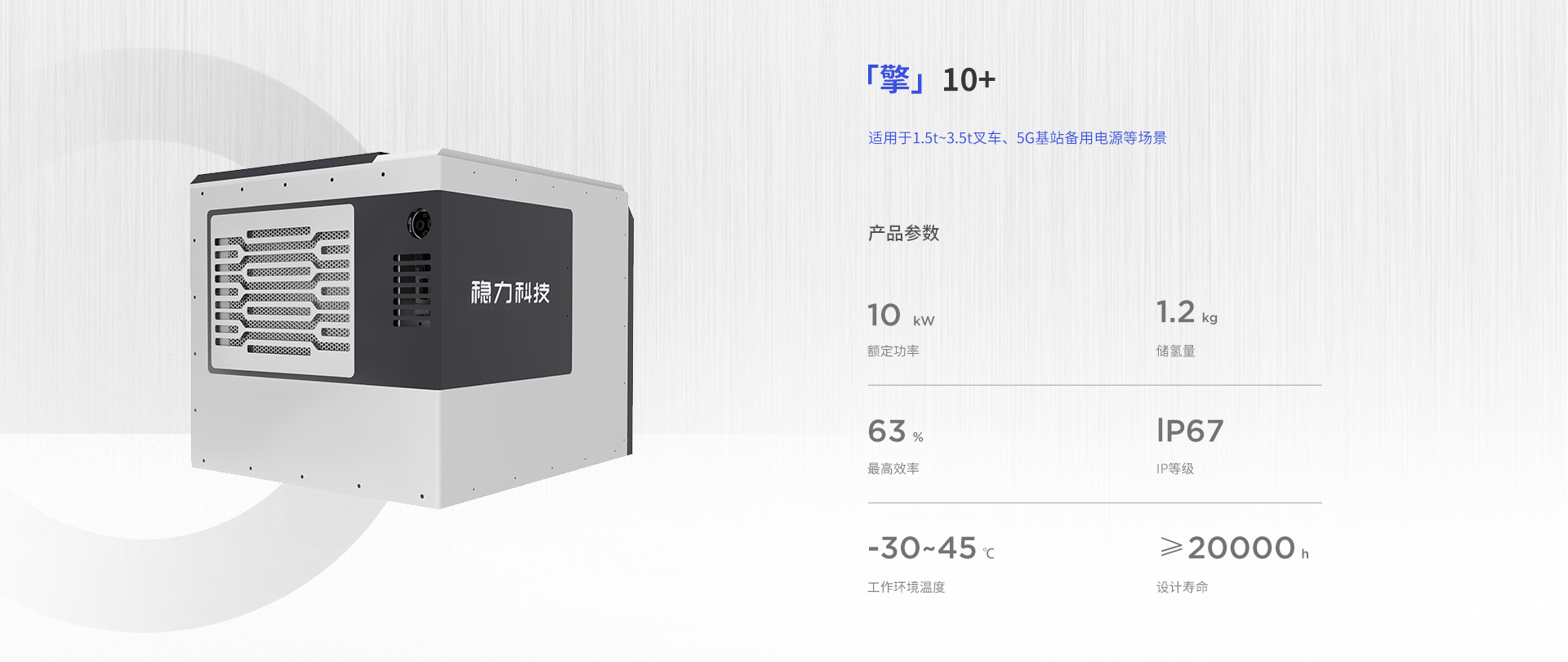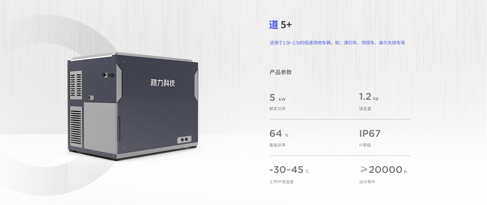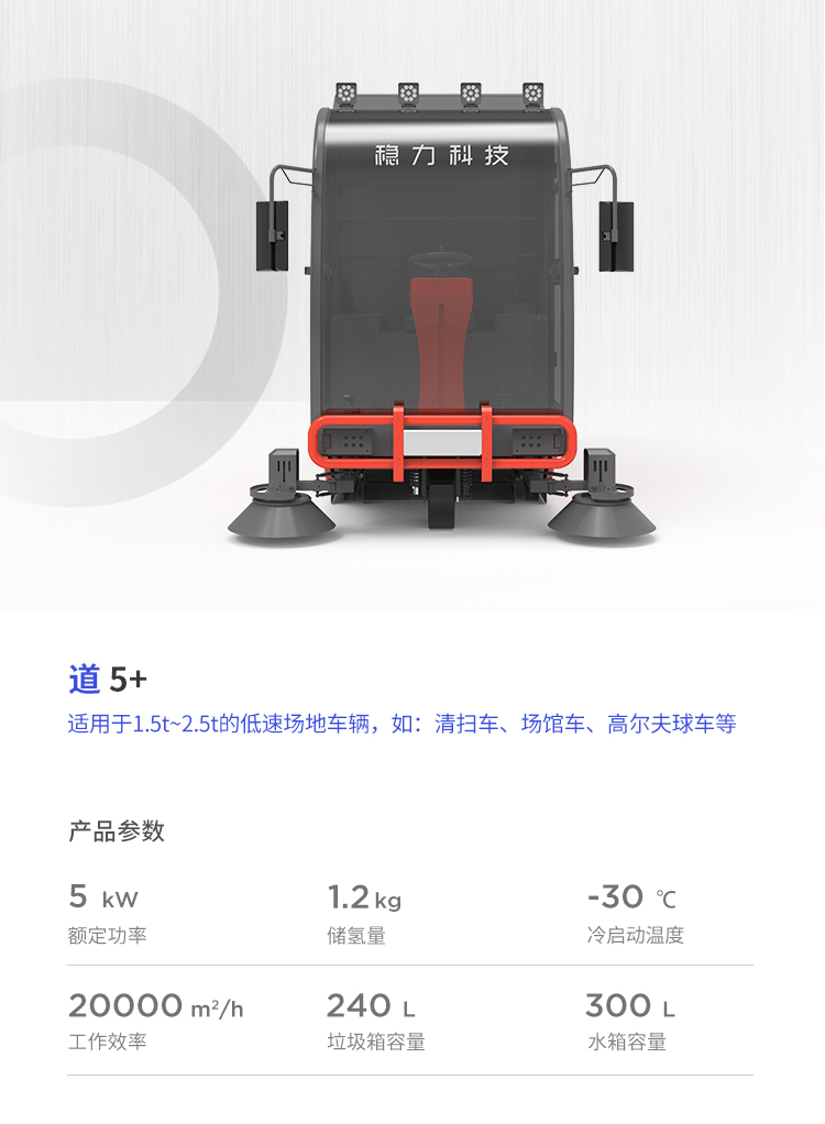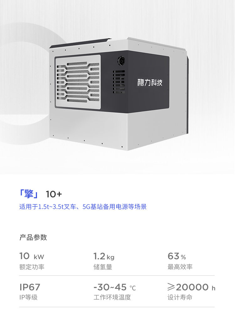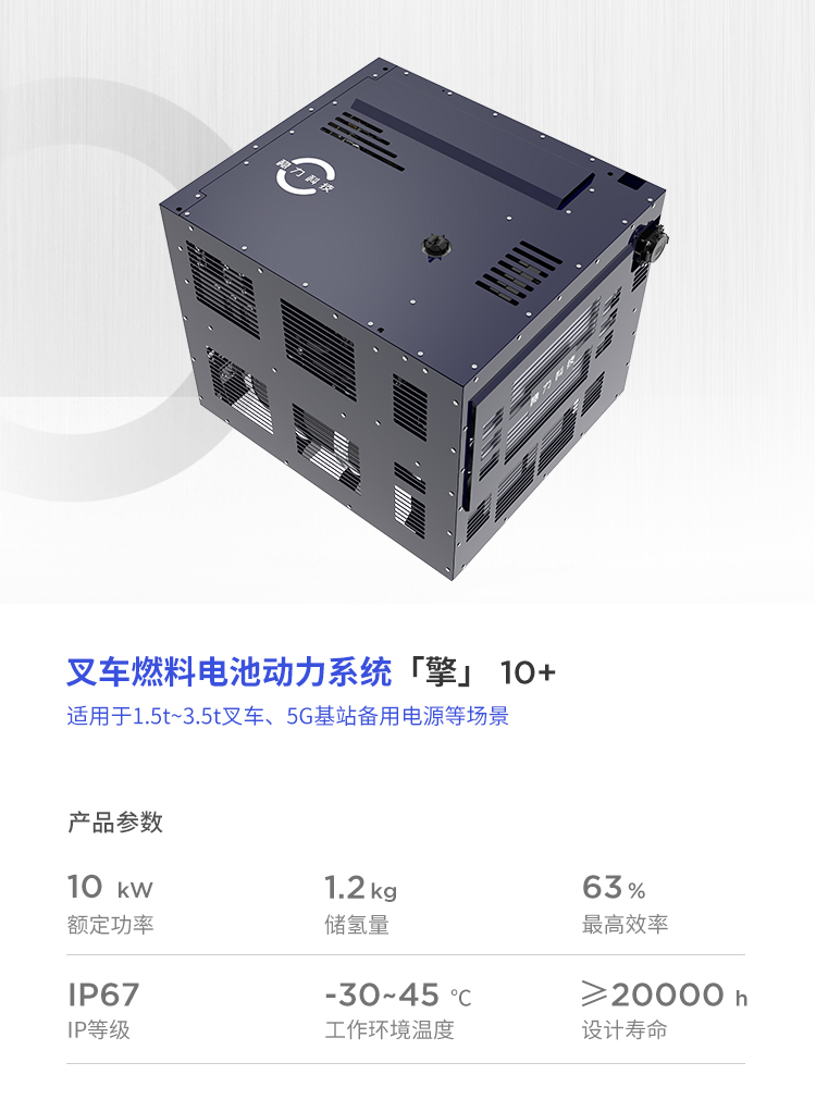 該系列燃料電(diàn)池系統功率覆蓋範圍8kW~40kW,可應用于1.5t~6t燃料電(diàn)池叉車。